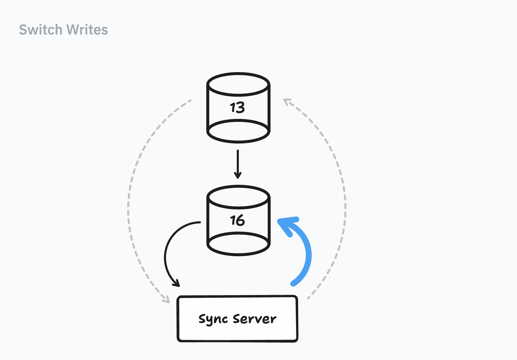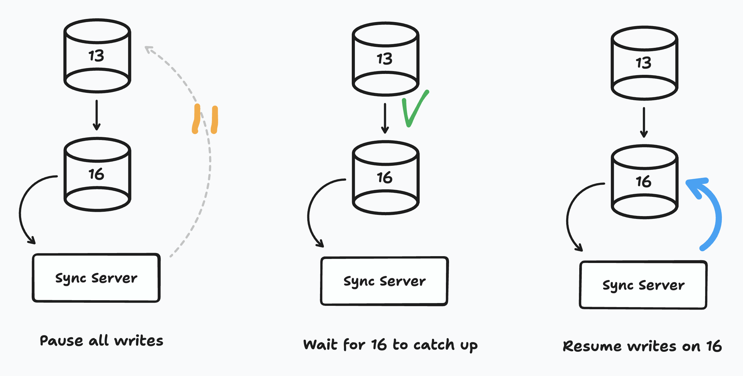 First, we would stand up a new replica running Postgres 16 — Let’s call this machine "16". Once 16 was running, we could get our sync servers to subscribe to 16. The remaining step would be to switch writes "all in one go" (what this meant TBD) to 16. When that was done, migration done.